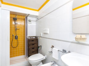 The tiled bathroom offers a stand-up shower with detachable showerhead, full size sink, mirror, linen drawers, toilet, and bidet.
