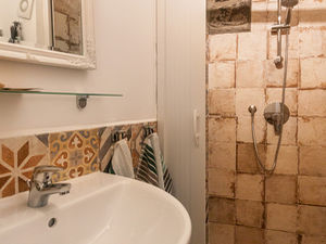 The tiled bathroom is adorned with an ancient arch which is the support to the local Church. It has stand-up shower with detachable showerhead, sink, mirror and toilet.